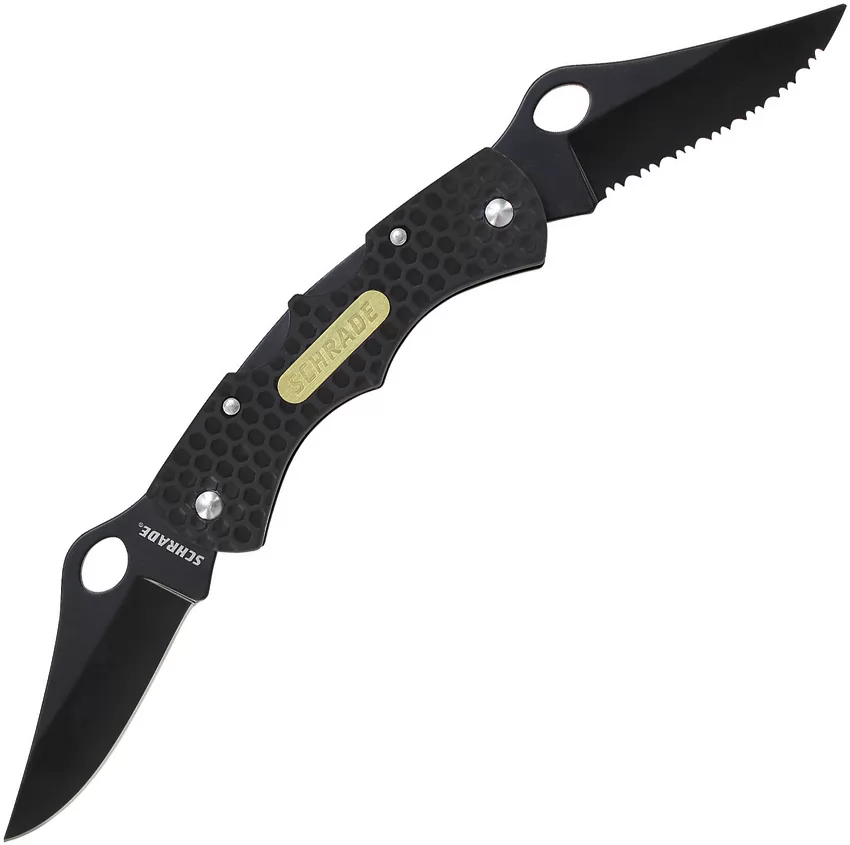 Schrade SCH005DLB Item Description:Craft the perfect cut with Schrade's Double Lockback Clip (SCH005DLB). Its durable 8Cr13MoV blade holds an edge with exceptional toughness, while the dual lockback mechanism ensures secure handling in demanding situations. The ergonomic polymer handle provides a comfortable grip for extended use. Ideal for daily tasks or outdoor adventures, this versatile knife combines exceptional quality and a budget-friendly price. Closed: 4"; Blade: 3" l Stainless l Standard Edge l Black Finish; Handle: Black l Plastic; Other Info: Thumb Slot l Inlay Shield l Pocket Clip. Double clip blades, one serrated and one standard edge blade. Boxed.