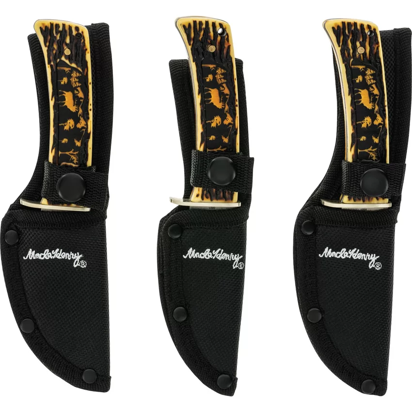 Uncle Henry. 7.13" (18.11cm) overall. 3.25" (8.26cm) satin finish stainless blade. Staglon handle. Brass guard. One each: drop point, clip point, and guthook blades. Elk handle artwork. Clam packed.