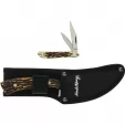 Uncle Henry. Satin finish high carbon stainless blade. Staglon handle. Includes: 7.5" overall skinner with 3.75" two tone finish blade; 2.75" folder with mirror polish clip point blade. Black polyester belt sheath. Clam packed.