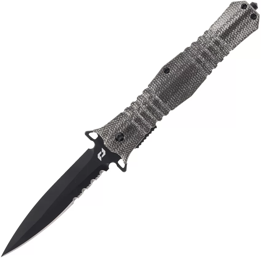5.25" (13.34cm) closed. 3.75" (9.53cm) black finish partially serrated D2 tool steel dagger blade. Black micarta handle. Glass breaker. Extended tang. Pocket clip. False top edge. Boxed with hanging tab.