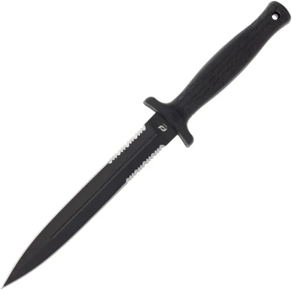 10.75" (27.31cm) overall. 6" (15.24cm) black powder coated partially serrated AUS-8 stainless dagger blade. Black rubberized steel handle. Lanyard hole. Black molded plastic belt sheath. Clam packed.