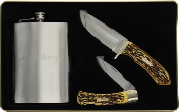 Uncle Henry. Satin finish stainless blade. Staglon handle. Inlay shield. Includes: 7" overall fixed blade with 3.25" drop point blade and brass guard; 3.75" closed lockback with 2.75" blade and nickel silver bolster. Comes with stainless flask and gift tin. Clam packed.