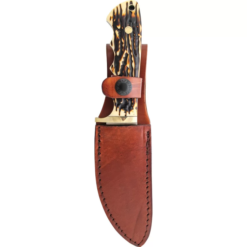 Uncle Henry. 8.5" (21.59cm) overall. 3.88" (9.86cm) satin finish 7Cr17MoV stainless blade. Finger grooved Staglon handle. Brass guard. Lanyard hole. Full tang. Brown leather belt sheath. Boxed.