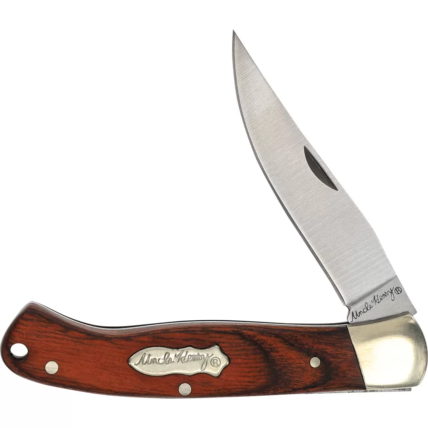 Uncle Henry. Satin finish stainless blade. Brown wood handle. Includes: 8" overall fixed blade with 3" drop point blade; 3.5" folder with 2.5" clip point blade, nickel silver bolser, and inlay shield; Sharpening stone. Black polyester belt sheath. Clam packed.
