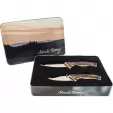 Uncle Henry. Satin finish stainless blade. Staglon handle. Includes: 8" overall fixed blade with 3.5" drop point blade; 3.88" closed linerlock with 2.88" blade, thumb stud, and pocket clip; Gift tin. Clam packed.