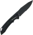4.63" (11.76cm) closed. 3.5" (8.89cm) black finish partially serrated high carbon stainless clip point blade. Black polymer handle. Thumb stud. Lanyard hole. Pocket clip. Clam packed.