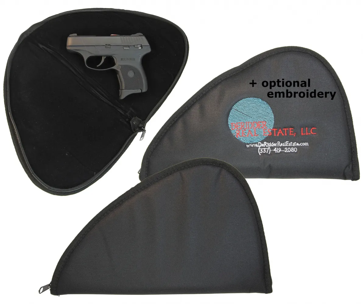 $24.99Sheaths SOFT_BLACK_PISTOL_CASE_12x7-5_LOGO_EMBROIDERY Item Description:There is no better place to store your six than in this soft cushioned pistol case. This pistol case is 12 inches long by 7.5 inches high. When empty and closed, the overall thickness of the case is 1.5 inches. The style of this soft pistol case is such that it sort of forms around your handgun like a taco shell, only that the taco shell is soft and has a zip that closes it completely. In addition to being an extremely affordable storage for your handgun, this pistol case is great for personalized embroidery. Put your name on it, put your company logo on it, or embroider what model number handgun is inside so you can organize your equipment. This particular listing has custom logo/graphics embroidery already included. Just provide instructions during your checkout. There will be a text box in the checkout process where you can enter your embroidery instructions. Also, since this is a graphics embroidery we will need you to email us your company logo or whatever graphics you would like embroidered on the case.