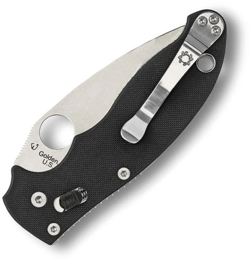 The blade is teamed up beautifully by the textured Black G10 handle. This has a fantastic grip to it, that even when your hands are wet or wearing gloves, you will still have control. To help improve the knife and make it stronger Spyderco have added scalloped full steel liners and an encased ball bearing lock. This is now a formidable knife that anyone would be proud to call their own.