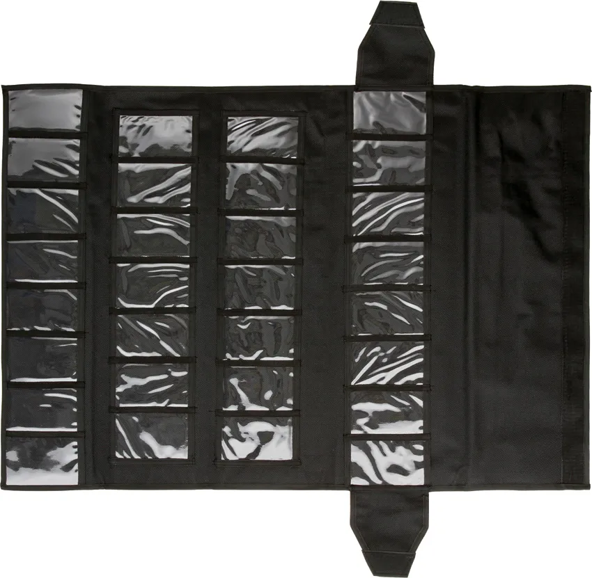 Dimensions: 25" x 8". 32 interior pockets measure 4.5" x 2.5". Black polyester denier construction with oversized clear viewing pockets. Velcro top and side closures. Adjustable shoulder strap. Gold embroidered Spyderco bug logo.