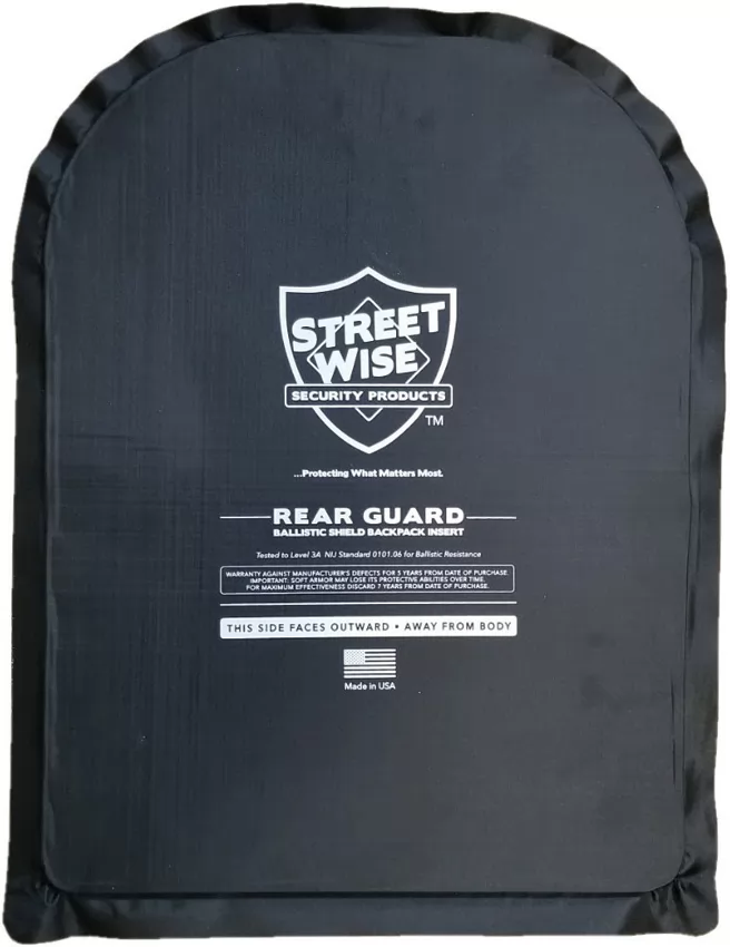 Dimensions: 11" x 14". Ultra high molecular weight polyethylene. Rated Level 3A. Can stop all handgun rounds. Converts ordinary backpack or laptop into a ballistic shield. Lightweight and flexible. Bulk packed.