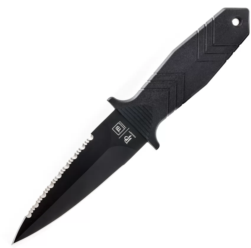 The TB Outdoor Protecteur Tactical Knife (BRK-TBO002) is a robust and reliable tool designed for demanding situations. This knife boasts a durable blade crafted from high-quality steel, ensuring exceptional sharpness and edge retention. The ergonomic handle provides a secure and comfortable grip, even in wet or gloved hands. Features include a sturdy locking mechanism for safe use and a versatile sheath for convenient carry. This is a valuable asset for professionals and outdoor enthusiasts alike. 8.25" (20.96cm) overall. 4" (10.16cm) black PVD coated partially serrated MOX steel dagger blade. Black PA6 handle. Black Kydex sheath. Storage case.