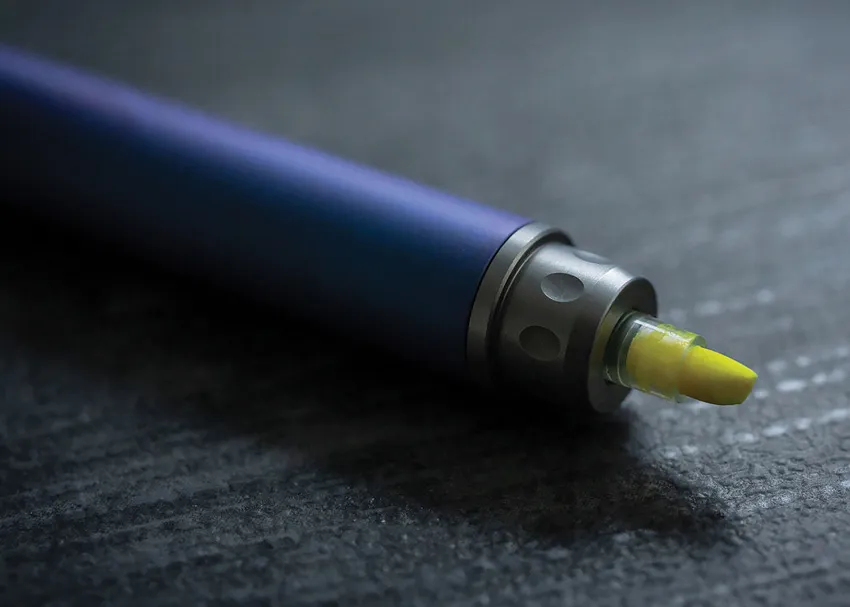 3.88" overall. Everyday carry highlighter/marker. Stonewash finish. Clipless cap. Comes with tip module, black ink refill, yellow highlighter refill, additional tip module. Color: Blue raspberry. Boxed.