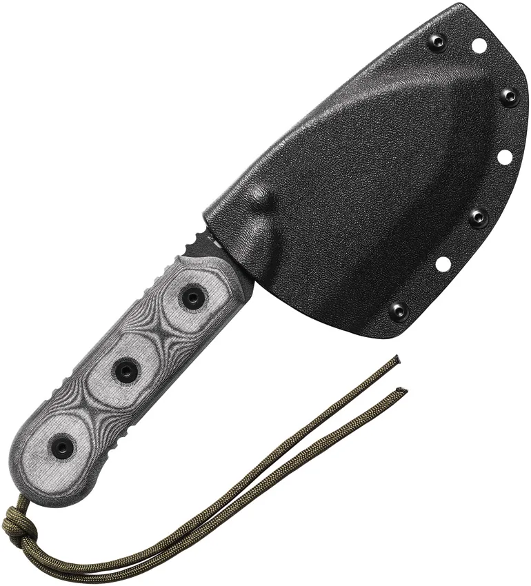 MAAP Price $143.20" 9" overall. 4" black traction coated 1095 high carbon steel blade. Full tang. Black linen micarta handles with lanyard. Black Kydex belt clip sheath.