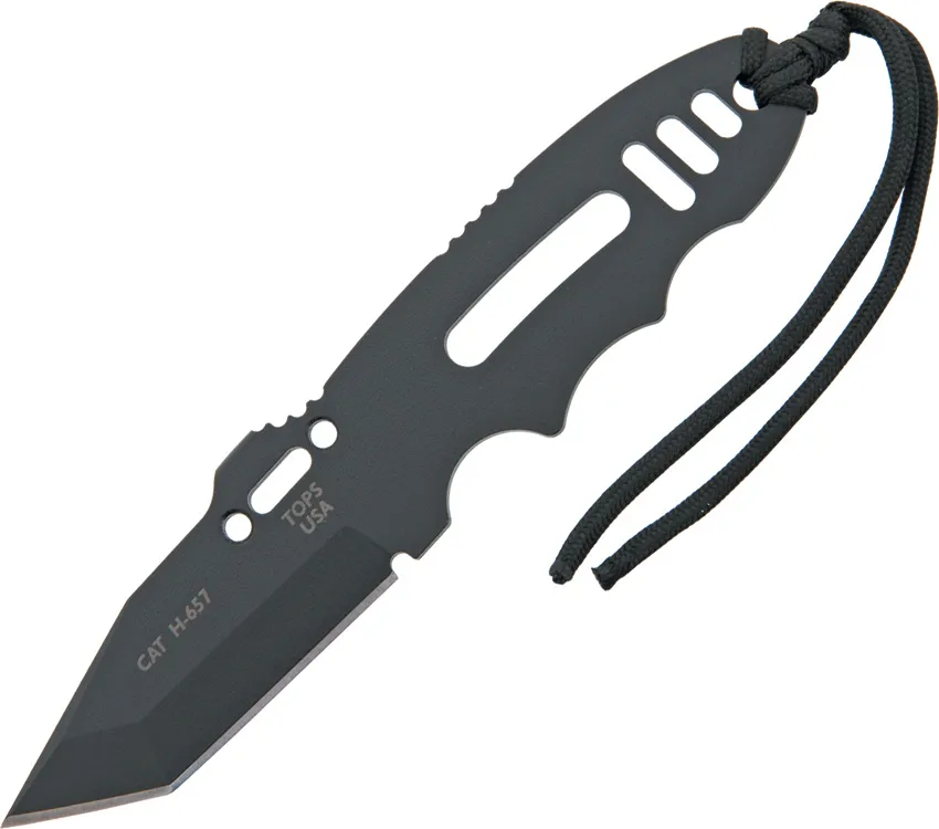 $159.95$101.60TOPS TP202 Item Description:Tops Covert Anti-Terrorism. 7 1/4 overall. 3" tanto blade. One piece 1095 high carbon steel construction with black traction coating. Skeletonized handle. Lanyard. Black Kydex belt sheath.