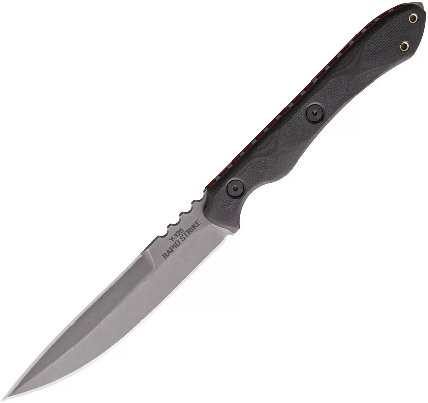 Rapid Strike. 8.5" (21.59cm) overall. 4" (10.16cm) tumbled finish 154CM stainless blade. Black G10 handle. Full tang. Glass breaker. Lanyard hole. Sharpened top edge. Black Kydex belt sheath. Designed by Leo Espinoza. Bulk packed.