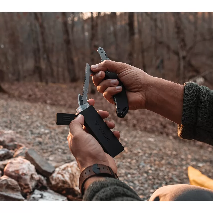 4.5" (11.43cm) closed. 3.5" (8.89cm) black oxide coated 5Cr13MoV stainless tanto blade. Black G10 handle. Lanyard hole. Pocket clip. Includes: (2) Drop point blades; (1) Titanium coated 65Mn steel saw blade. Two step replaceable blade system. Toggle lock. Ball bearing flipper. Blade case. Boxed with hanging tab.