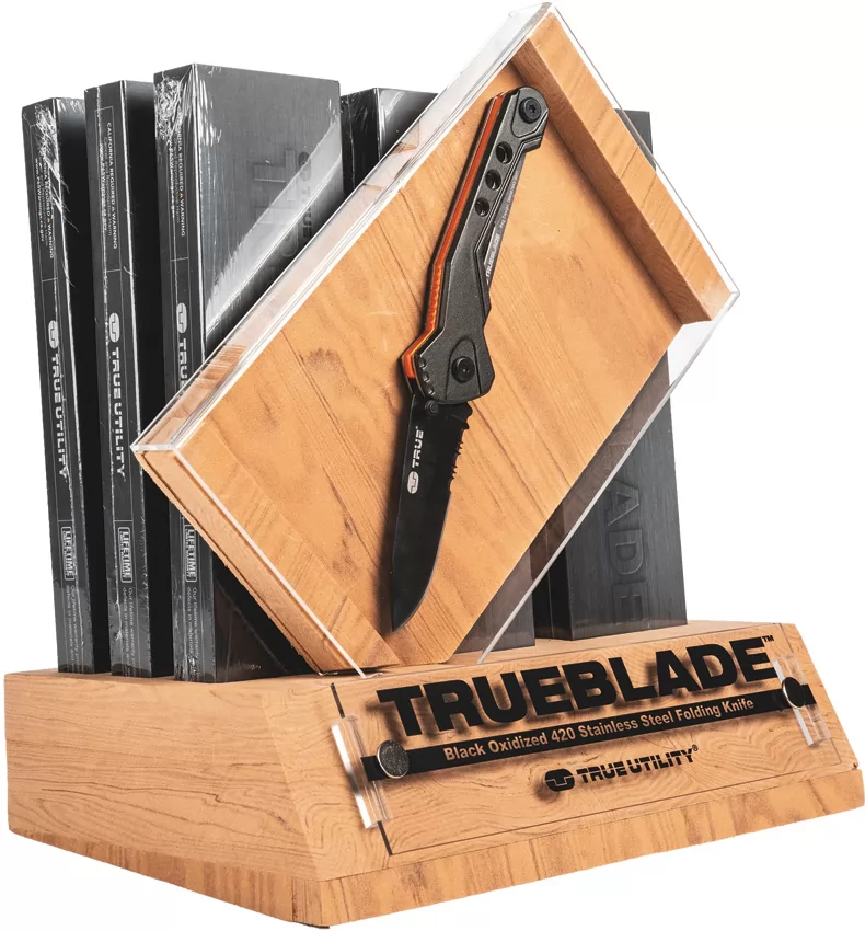 Dimensions: 9" x 6.5" x 12". Display showcases (1) Trueblade in front (included) and holds (9) Trueblade in gift boxes in back (not included). Boxed. Free with purchase of 9 TRU6871. Customer must request free item.