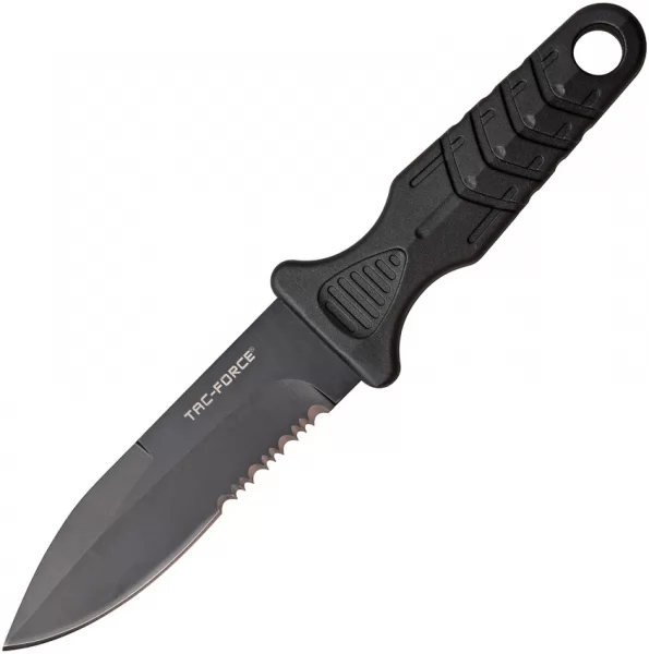 7" overall. 3.5" black finish partially serrated 3Cr13 stainless blade. Black nylon handle. Lanyard hole. Black nylon belt sheath. Boxed.