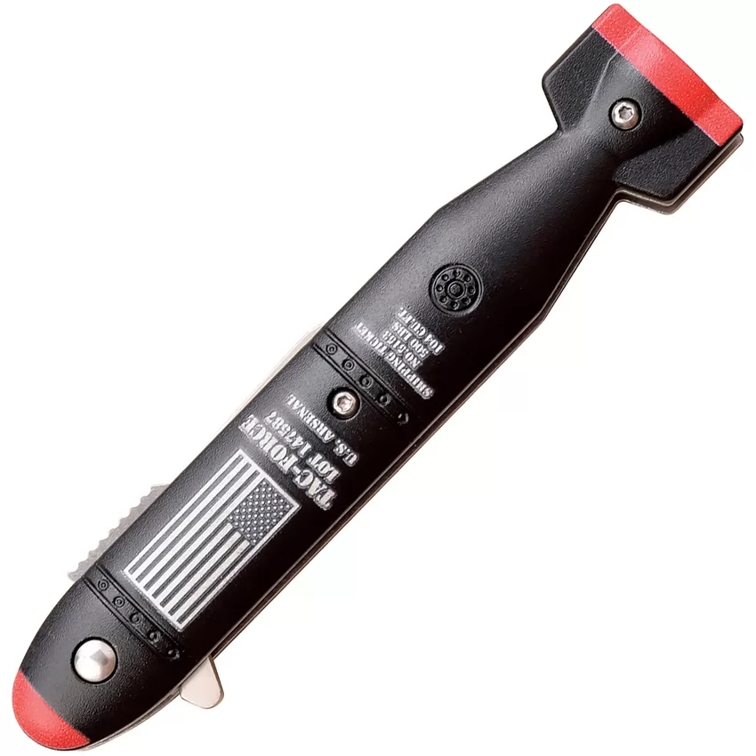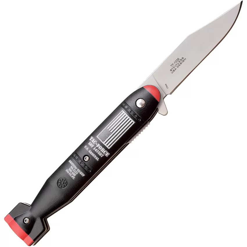 The Tac Force BRK-TF1039LFG Linerlock A/O Black offers rapid blade deployment with its assisted opening mechanism. This durable knife features a sturdy liner lock to secure the blade during use. Its black finish provides a sleek and tactical look, making it a reliable tool for everyday carry and outdoor adventures. Get a dependable cutting companion that combines speed, strength, and style. Assisted opening. 4.75" (12.07cm) closed. 3.75" (9.53cm) stonewash finish 3Cr13 stainless clip point blade. Black aluminum handle. Extended tang. Pocket clip. Bomb shaped handle with American flag artwork. Boxed.