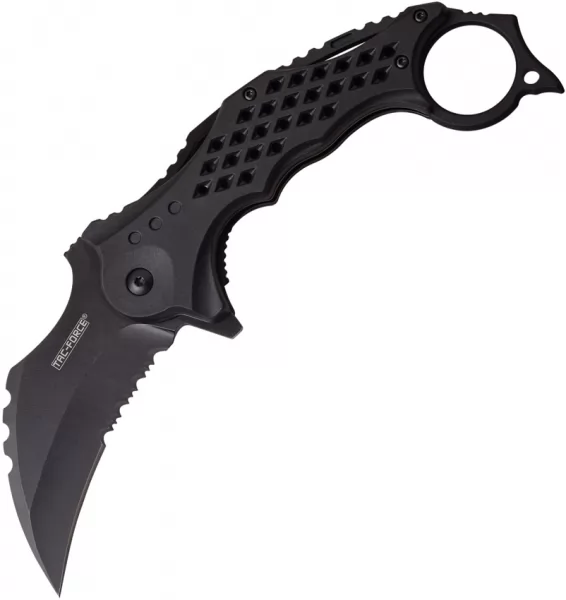 The Linerlock A/O Black TF945BK from Tac Force is a compact and reliable folding knife designed for everyday tasks. Its 3.25-inch stainless steel blade features a black finish and a sharp Tanto point, providing excellent cutting performance. The aluminum handle offers a secure grip with a liner lock mechanism for added safety. This knife includes a sturdy pocket clip for convenient carry and is perfect for tactical enthusiasts or those seeking a versatile tool. Linerlock. Assisted opening. 5.5" closed. 3.25" black finish partially serrated 3Cr13 stainless karambit blade. Black ABS handle. Finger ring. Glass breaker. Lanyard hole. Extended tang. Pocket clip. Boxed.