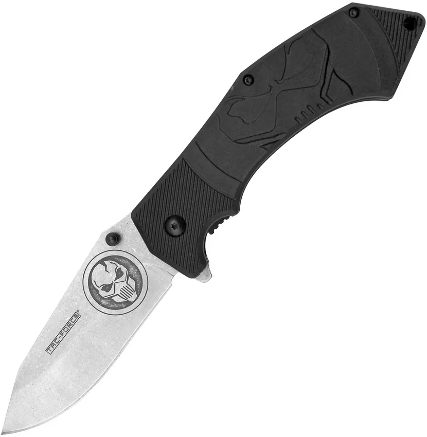Tac Force TF959SW Item Description:Take on your next task with confidence with the Tac Force Linerlock A/O SW. Engineered with a premium stainless steel blade, this knife effortlessly tackles any cutting requirement. Its compact design and easy open-assist mechanism provide unparalleled convenience, while the durable liner lock ensures a secure grip. Whether you're navigating through everyday tasks or embarking on an outdoor adventure, this versatile tool is your go-to choice for precision cutting and unwavering performance. Linerlock A/O. Assisted opening. 5" closed. 3.63" stonewash finish 3Cr13 stainless drop point blade. Black nylon handle. Extended tang. Thumb stud. Pocket clip. Lanyard hole. Skull handle artwork. Boxed.
