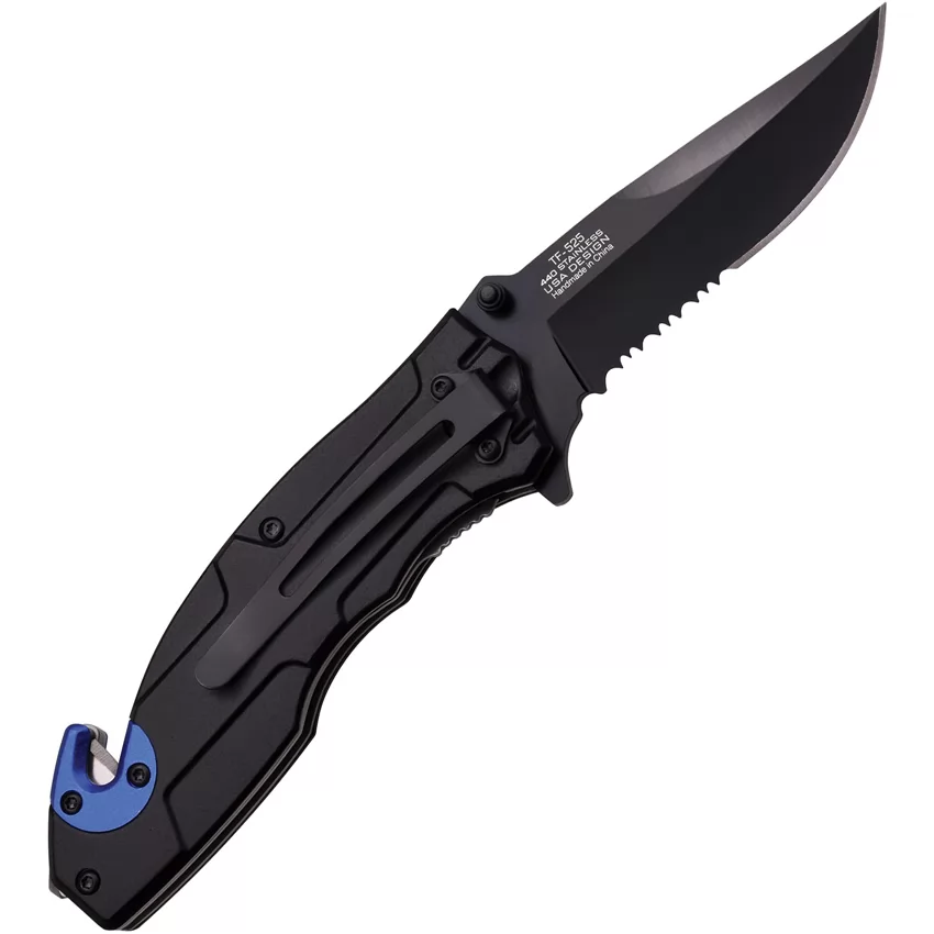 Assisted opening. 4.5" (11.43cm) closed. 3" (7.62cm) black finish partially serrated stainless blade. Black and blue aluminum handle. Extended tang. Belt/cord cutter. Glass breaker. Pocket clip. Thumb stud. Boxed.