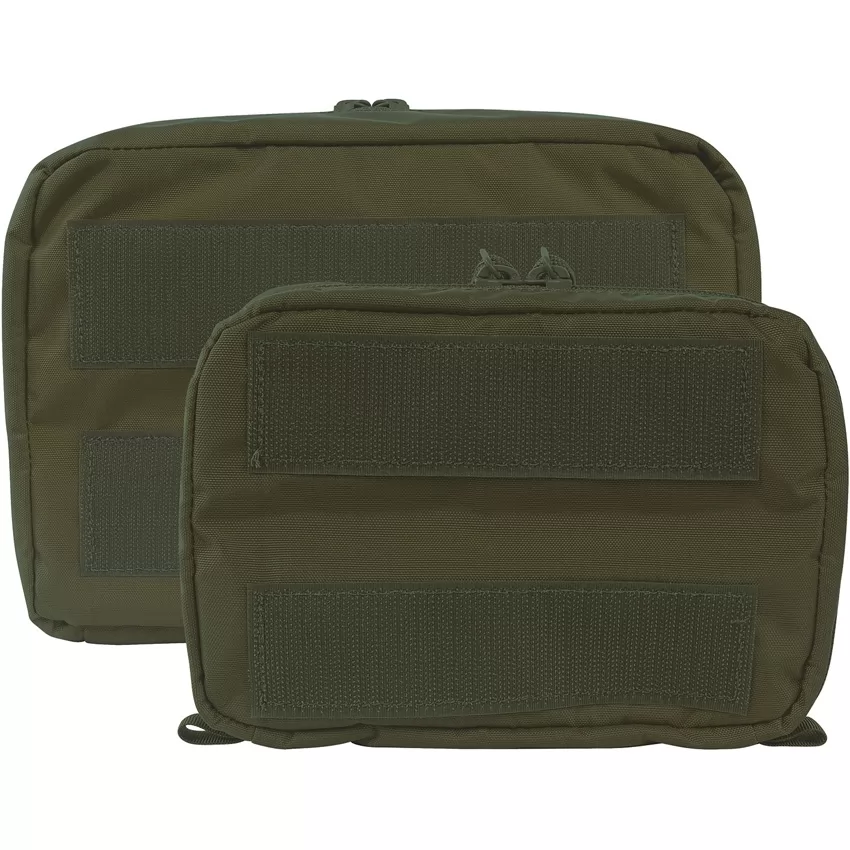 Pouch dimensions: Small- 7" x 5" x 2"; Large- 10" x 7" x 2". Selection of colored hook and loop strips. Blind hook and loop fastening available. Flexible and transparent front. 420 HD nylon construction. Color: Coyote Brown. Bulk packed.