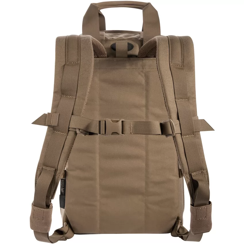 Dimensions: 17.7" x 10.25" x 5.13". Padded back with height adjustable chest belt and two stowable shoulder straps. Integrated, reversible rain cover with marker system in the bottom compartment. Two removable hook & loop inner pockets with transparent lid. Hook & loop closure patch on front with daisy chain. Two zippered front compartments with two hooks for attaching additional pouches or panels. Carry handles can be stored in side pockets. Separate compartment for use with a hydration system (not included). 700D Cordura construction. Color: Coyote Brown. Bulk packed.