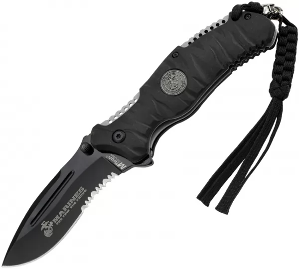 The USMC Knives Reaper A/O Black (USMA1020BK) offers rapid blade deployment with its assisted-opening mechanism, making it a dependable tool for any situation. Crafted with a durable black-coated stainless steel blade and a textured G-10 handle, this knife provides a secure and comfortable grip. The Reaper A/O is a solid choice for everyday carry or tactical applications, boasting a reliable liner lock and convenient pocket clip for enhanced portability. It's a practical and robust addition to any collection. 4 3/4" closed linerlock. 3 5/8 black finish 440C stainless partially serrated spear point blade with dual thumb studs and extended tang. Assisted opening blade. Thick, grooved black rubberized handles with USMC inlay medallion shield. Top of handles feature a partially opened spine with a drilled hole design and ridge. Lanyard hole with black braided nylon lanyard and skull bead. Black stainless pocket clip.