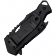 Assisted opening. 3.75" (9.53cm) closed. 2.5" (6.35cm) black finish stainless blade. Black and red aluminum handle with black stainless back handle. Extended tang. Thumb pull. Lanyard hole. Pocket clip. Bottle opener. Boxed.