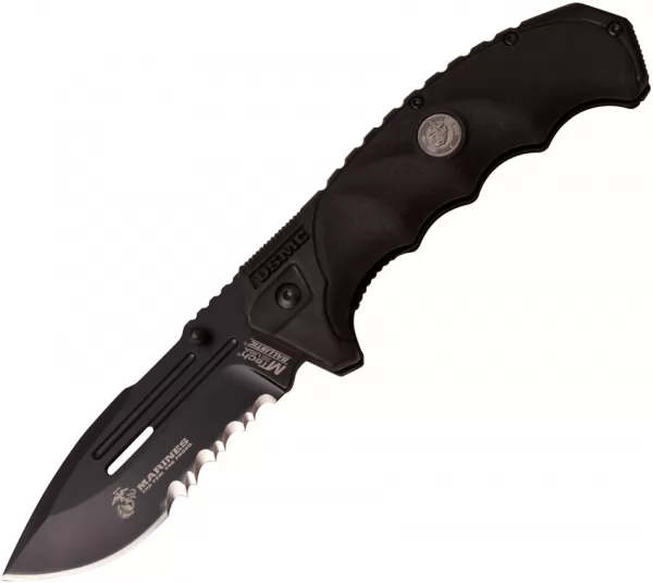 The USMC Linerlock A/O Black, model USMA1053BK by USMC Knives, provides reliable performance in a sleek, tactical package. This assisted-opening knife features a durable black-coated blade, ensuring lasting sharpness and corrosion resistance. Its robust linerlock mechanism secures the blade open for safe and confident use, while the ergonomic grip provides a comfortable and secure hold. Ideal for everyday carry or demanding tasks, this USMC knife delivers dependable functionality when you need it most. Type: Assisted Opening; Closed: 5"; Blade: 3.75" l Stainless l Partially Serrated Edge l Black Finish; Handle: Black l Synthetic; Other Info: Inlay Shield l Thumb Stud(s) l Thumb Ridge l Pocket Clip l Extended Tang. Black rubber handle onlays. Boxed.