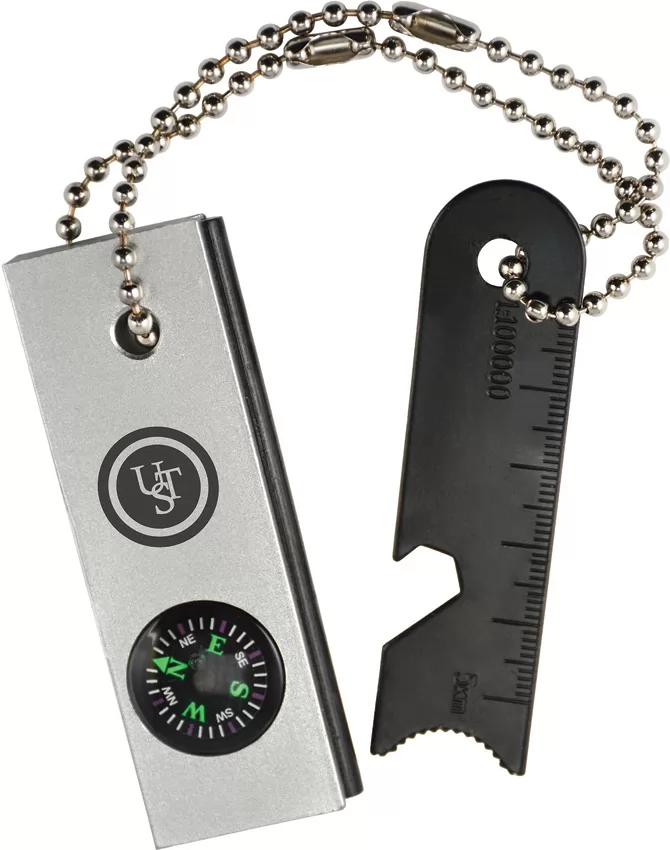 3" overall. Tools include: Tinder scraper I Hex wrench I Compass I Flint I Striker I Ruler I Rescue mirror. Slight rust on the chain. Hang packaged.