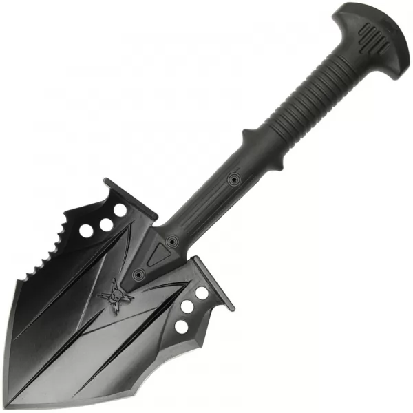 16 1/4" overall. 6 7/8" x 5 1/2" overall black oxide coated tempered 2Cr13 stainless tool steel shovel head. Shovel point is sharpened on each side featuring a partially serrated edge on one and a concave chopping edge on the other. Also features multiple lashing holes. Black injection-molded nylon handle with 30% fiberglass and nylon reinforcement. Black reinforced nylon belt sheath. Perfect for camping and outdoors use, light chopping or for use as a defensive weapon in an emergency situation.