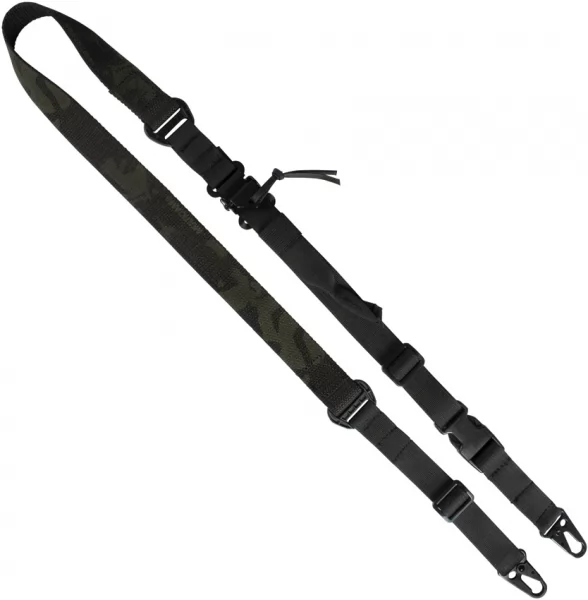 D2. Two point connection with stainless HK hooks. Rapid resizing with non-slip quick release side buckle. Ambidextrous. Sling length is adjustable from 40" to 57". Made from 1.25" and 1" webbing. Color: Black Multi-Cam. Hang packaged.