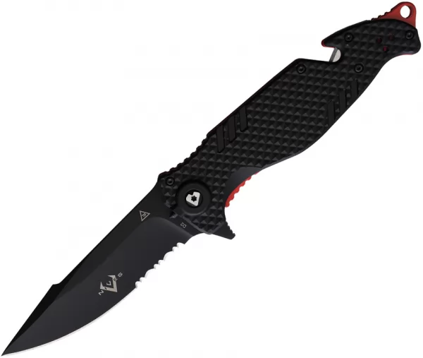 5" (12.7cm) closed. 3.75" (9.53cm) black finish partially serrated D2 tool steel blade. Black textured plastic handle. Extended tang. Belt/cord cutter. Glass breaker. Lanyard hole. Pocket clip. Red line on handle. Boxed.