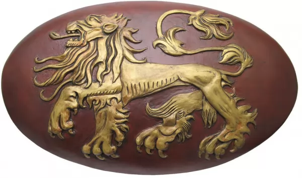 Dimensions: 31" x 18". Weight: 7lb. Fiberglass and resin construction. Embossed and painted with Lannister sigil. Includes black painted wall mount with three hanging slots. Each shield is individually serialized with Certificate of Authenticity. Officially licensed Game of Thrones replica. Boxed.
