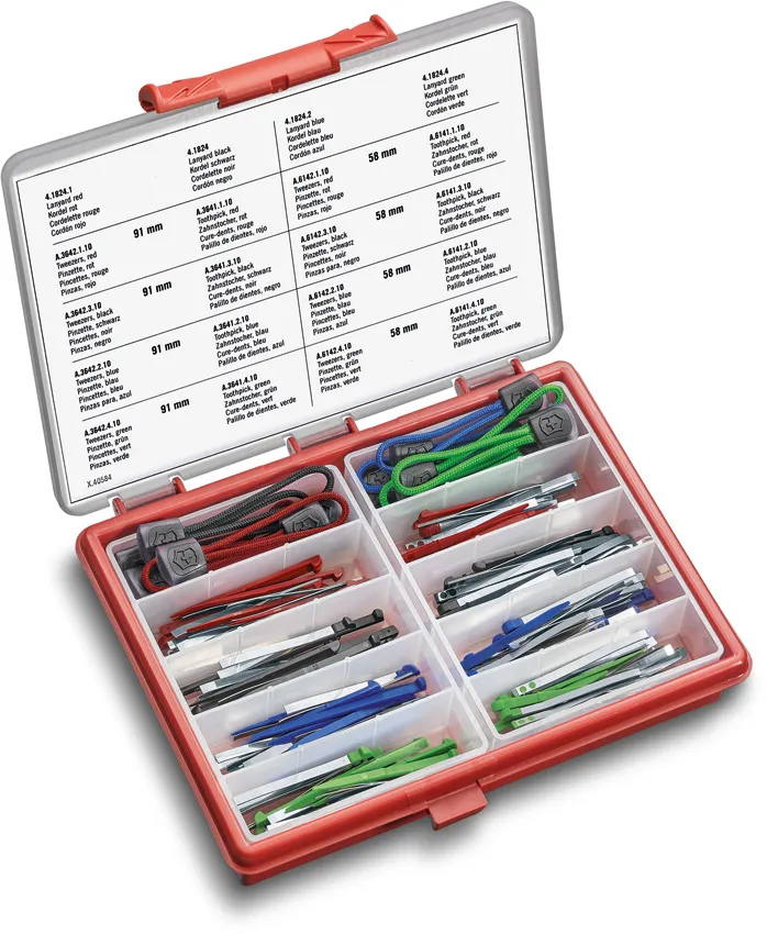 Includes: (10) large tweezers (red, blue, black, green); (10) large toothpicks (red, blue, black, green); (10) small tweezers (red, blue, black, green); (10) small toothpicks (red, blue, black, green); (5) Lanyards (red, blue, black, green). Storage case.