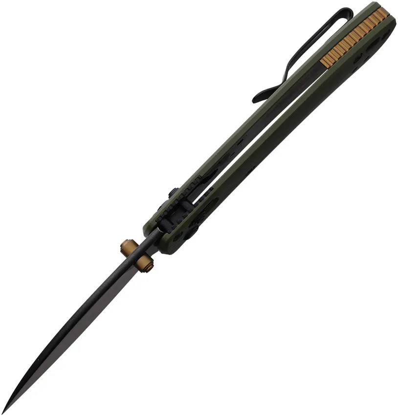3.75" (9.53cm) closed. 2.63" (6.68cm) black stonewash finish 14C28N Sandvik stainless blade. Green G10 handle. Thumb stud. Lanyard hole. Pocket clip. Shilin cutter style blade. Black nylon zippered storage case. Boxed.