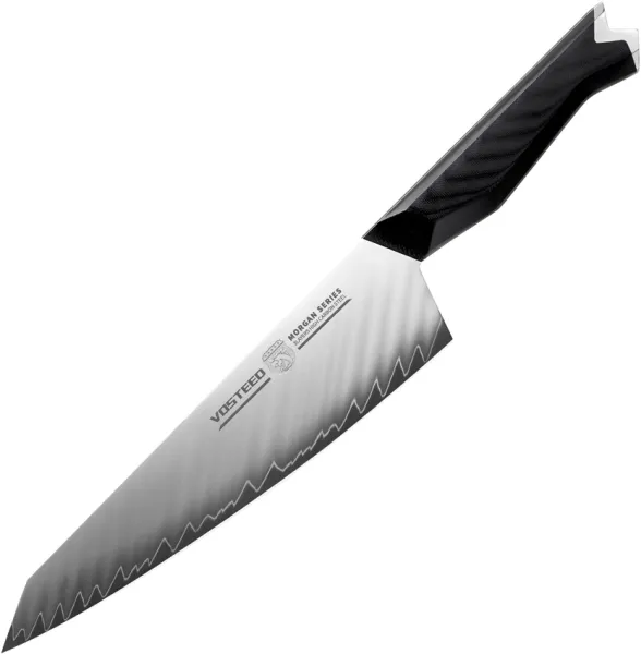 The Vosteed Morgan 8" Chef's Knife (BRK-VOSMGCH9C80) is expertly crafted for exceptional performance in any kitchen. Its high-quality steel blade holds a razor-sharp edge for effortless slicing, dicing, and chopping. The ergonomic handle provides a comfortable and secure grip, ensuring precise control. Prepare culinary masterpieces with confidence using this durable and versatile knife, designed for both professional chefs and home cooks alike.