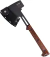 14" overall. 5" black stonewash finish 4140 alloy steel axe head with 3.75" cutting edge. Walnut handle. Full tang. Lanyard hole. Brown leather belt sheath. Boxed.