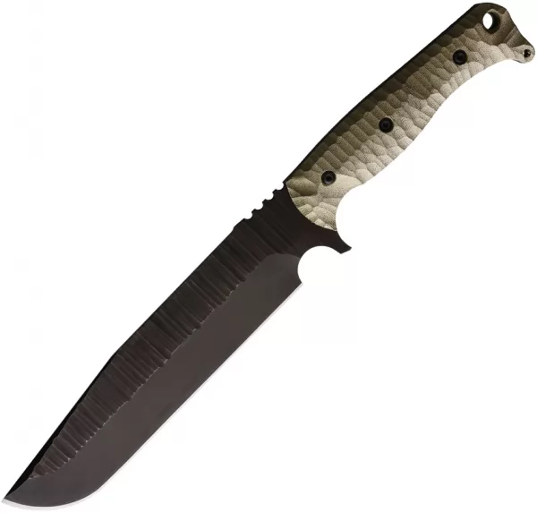 15" (38.1cm) overall. 9" (22.86cm) black oxide coated 80CrV2 carbon steel blade with stone grind. OD green sculpted micarta handle. Full tang. Lanyard hole. Black Kydex sheath. Boxed.