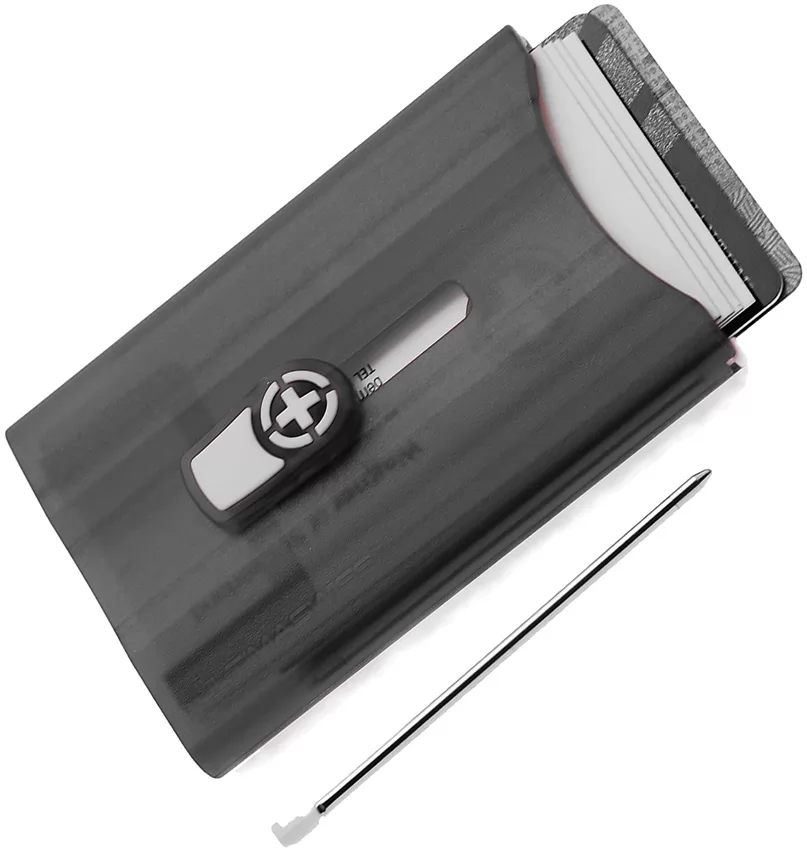 Dimensions: 3.5" x 3.5" x .25". Mechanism holds 1 to 5 credit cards, IDs, or multiple business cards. Reinforced stainless clip holds bills, or functions as a belt clip. Smooth action slide for quick access. Synthetic construction. Color: Black.