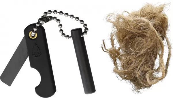 1.75" closed folder with ceramic blade for scraping. Ferro rod. Ball chain lanyard. Tinder. Boxed with hanging tab.