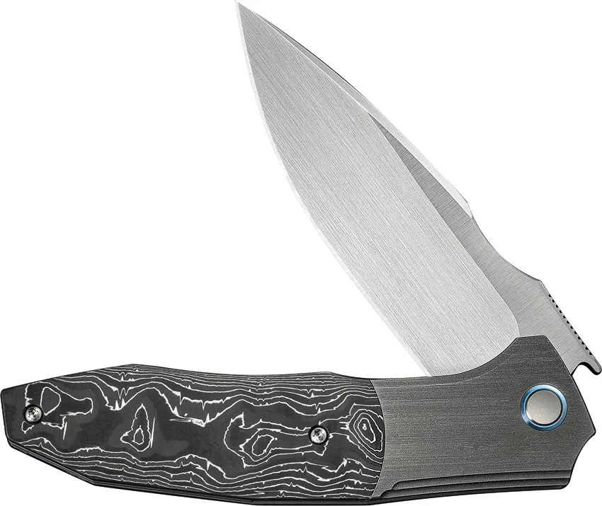 5" (12.7cm) closed. 4" (10.16cm) satin finish Bohler M390 stainless blade. Gray titanium handle with Aluminum foil carbon fiber inlay. Extended tang. Pocket clip. Black nylon zippered storage case. Boxed.