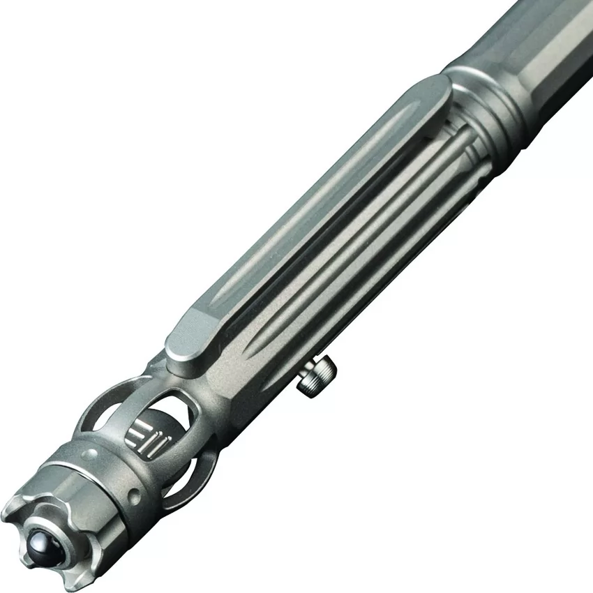 The We Knife Co Ltd Baculus Spinner Titanium Pen, model BRK-WETP07A, is a precision-engineered writing instrument and captivating fidget toy in one. Crafted from lightweight yet durable titanium, this pen features a smooth, reliable bolt-action mechanism for effortless point deployment and retraction. Its expertly balanced design allows for seamless spinning and manipulation, providing a satisfying tactile interaction for focus and stress relief. The Baculus pen utilizes standard Parker-style refills, ensuring a consistently enjoyable writing session. 5.38" overall. Spinner and glass breaker tip. Schmidt EasyFLOW 9000M ink cartridge. Titanium construction. Color: Gray. Boxed.