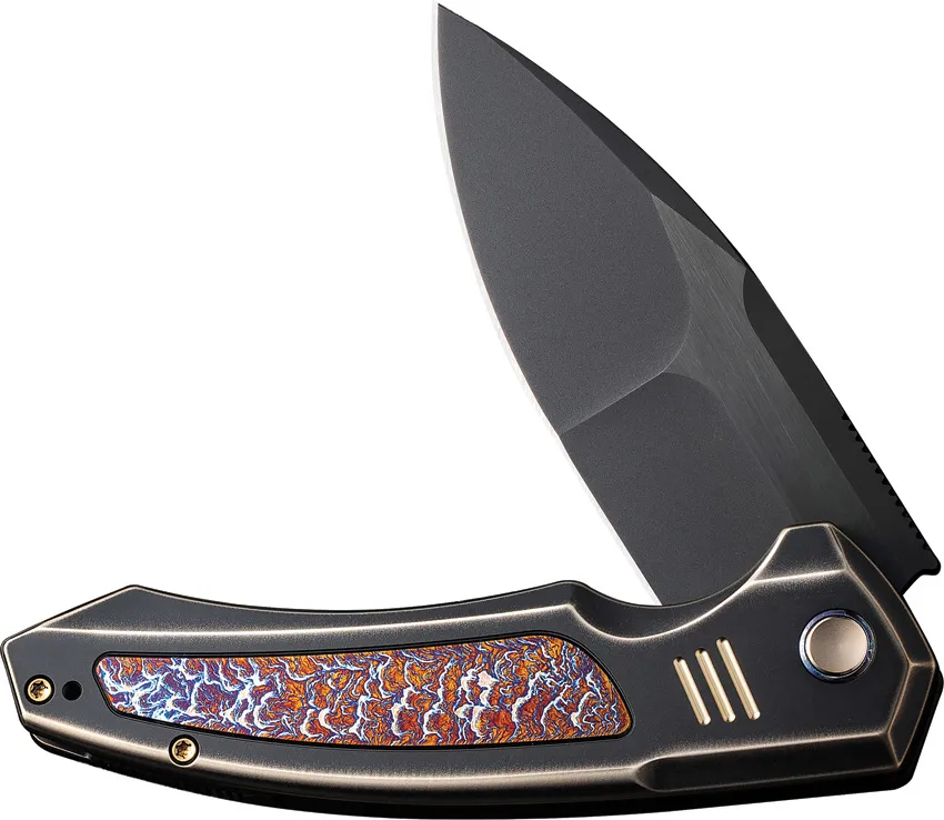 4.88" (12.4cm) closed. 3.88" (9.86cm) black stonewash finish blade. Black and bronze titanium handle with Flame anodized titanium inlay. Extended tang. Pocket clip. Vanax blade. Black nylon zippered storage case. Boxed.