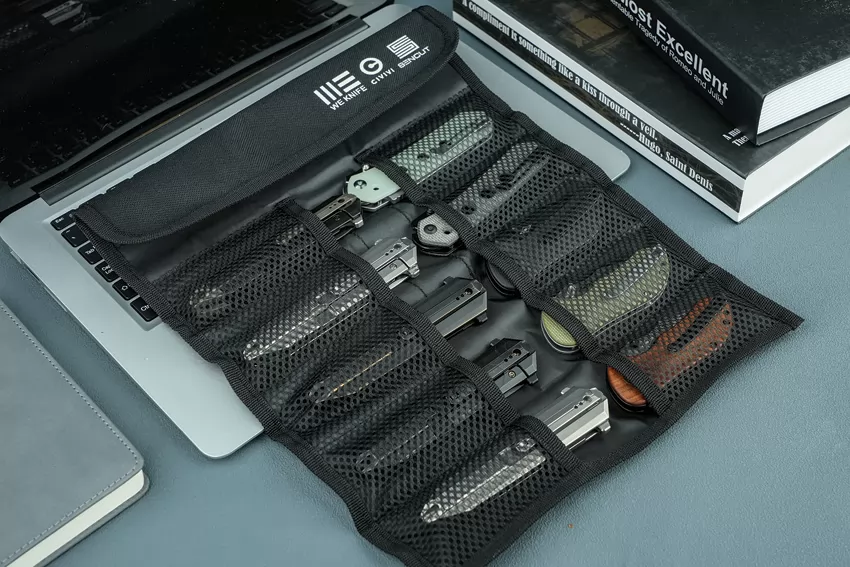 Hook & loop closure. Holds 10 folding knives. Nylon construction. Color: Black. Bulk packed. Free with any WE, Civivi, or Sencut purchase. Limit one per customer. Customer must request free item.