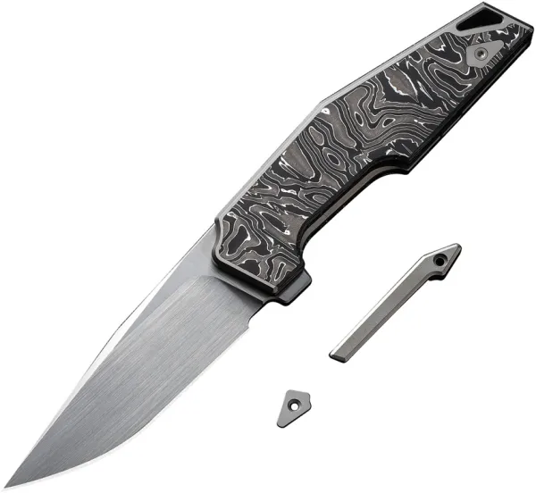 4.5" (11.43cm) closed. 3.5" (8.89cm) satin finish CPM-20CV stainless blade. Black titanium handle with Aluminum foil carbon fiber inlay. Extended tang. Lanyard hole. Pocket clip. Includes extra left carry titanium pocket clip and insert. Black nylon zippered storage case. Boxed.