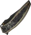 5" (12.7cm) closed. 4" (10.16cm) black stonewash finish Bohler M390 stainless clip point blade. Bronze stonewash finish titanium handle with Shredded carbon fiber inlay. Extended tang. Pocket clip. Thumb stud. Black nylon zippered storage case. Boxed.