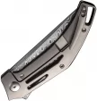 4.63" (11.76cm) closed. 3.38" (8.59cm) Damascus steel blade. Gray titanium handle. Extended tang. Lanyard hole. Pocket clip. Black nylon zippered storage case. Boxed.